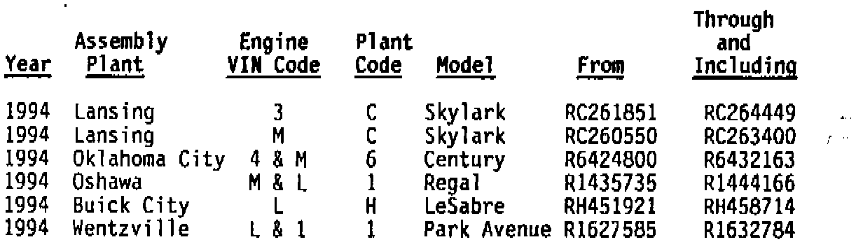 Involved are all 1994 Buick vehicles built within the illustrated "VIN" breakpoints.