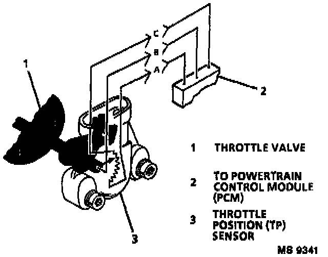 The Throttle Position (TP) sensor is a potentiometer connected to the throttle shaft on the throttle body. By monitoring the voltage on the signal line, the Powertrain Control Module (PCM) calculates throttle position. The PCM calculates fuel delivery based on throttle valve angle (driver demand).