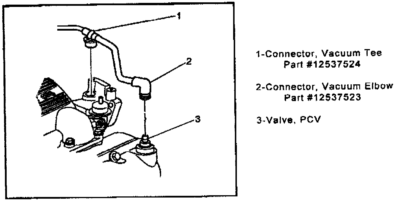 1. Replace the calibration PROM, using the service procedure from the appropriate service manual.2. Inspect the PCV connector tee at the upper intake plenum hole. If loose or cracked, replace connector with new connector, P/N 12537524. Inspect the fresh air elbow connector at the left rocker arm cover. If loose or cracked, replace connector with new connector, P/N 12537523.