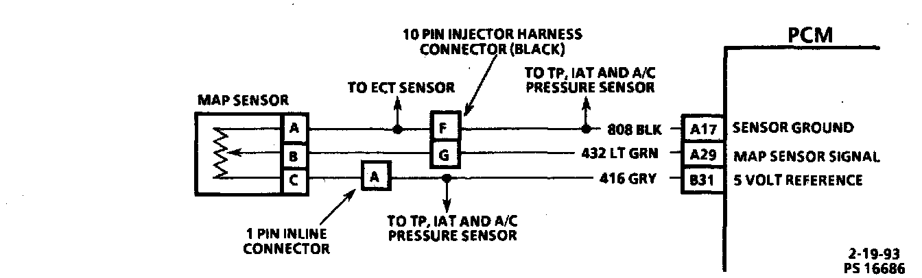 The Manifold Absolute Pressure (MAP) sensor measures the changes in the intake manifold pressure which result from engine load (intake manifold vacuum) and RPM changes and converts these into a voltage output. The PCM applies a 5 volt reference voltage to the MAP sensor. As the manifold pressure changes, the output voltage of the sensor also changes. By monitoring the sensor output voltage, the PCM calculates the manifold pressure. A lower pressure (low voltage) will be about 1-2 volts at idle, while higher pressure (high voltage) output voltage will be about 4-4.8 volts at Wide Open Throttle (WOT). The MAP sensor is also used under certain conditions to measure barometric pressure, allowing the PCM to make adjustments for different altitudes. The PCM uses the MAP sensor to control fuel delivery and ignition timing.