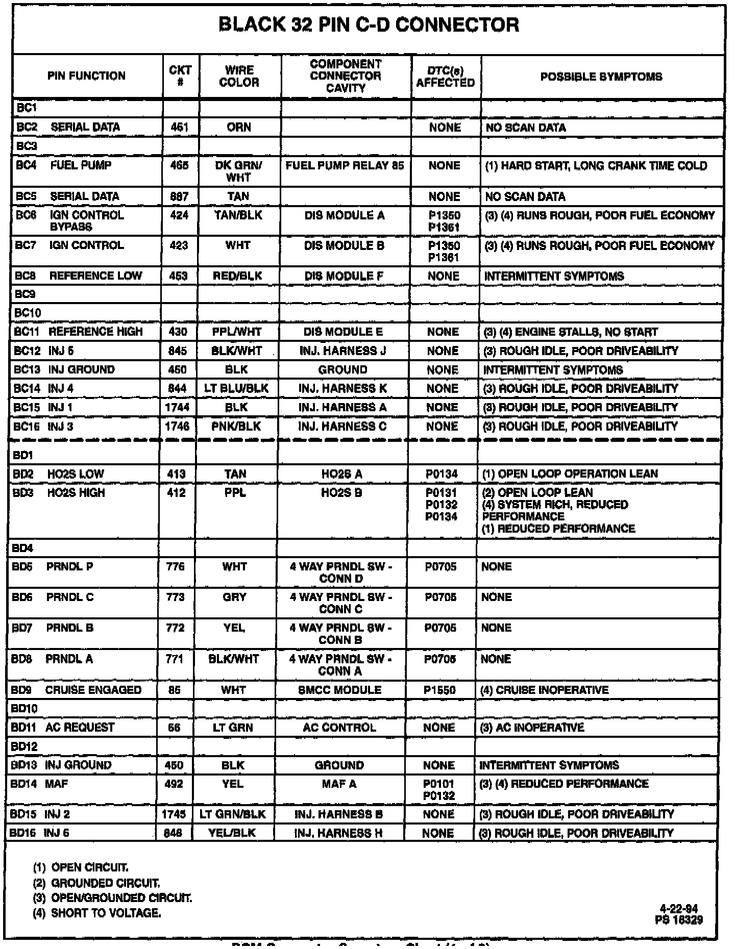 PCM Connector Symptoms Chart:
