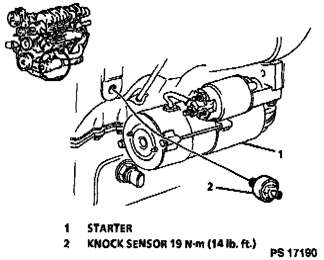 1. Knock sensor into engine block. Be sure threads are clean. Tighten to 19 Nm (14 ft lb).