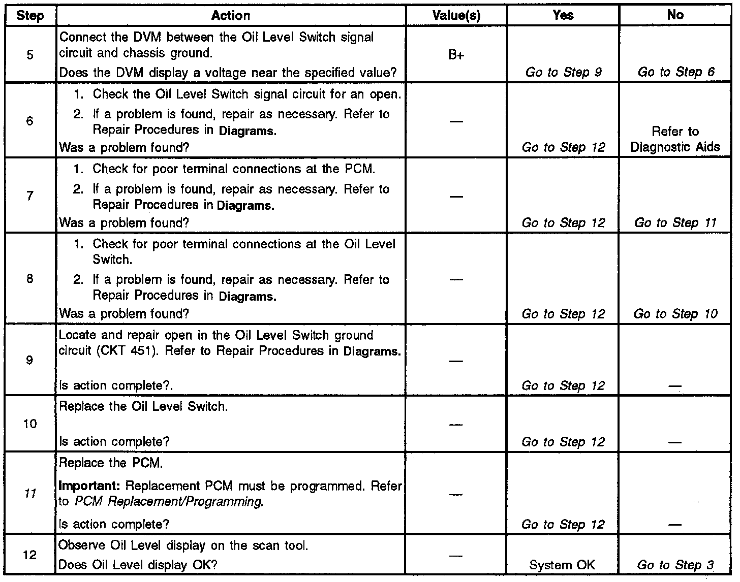 ^ Poor connection at PCM or oil level sensor. Inspect harness connectors for backed out terminals, improper mating, broken locks, improperly formed or damaged terminals, and poor terminal to wire connection.