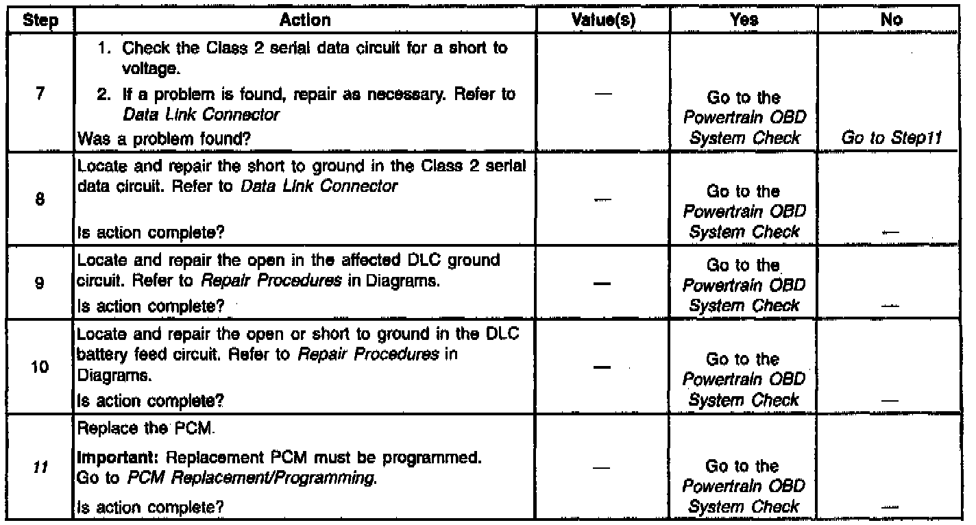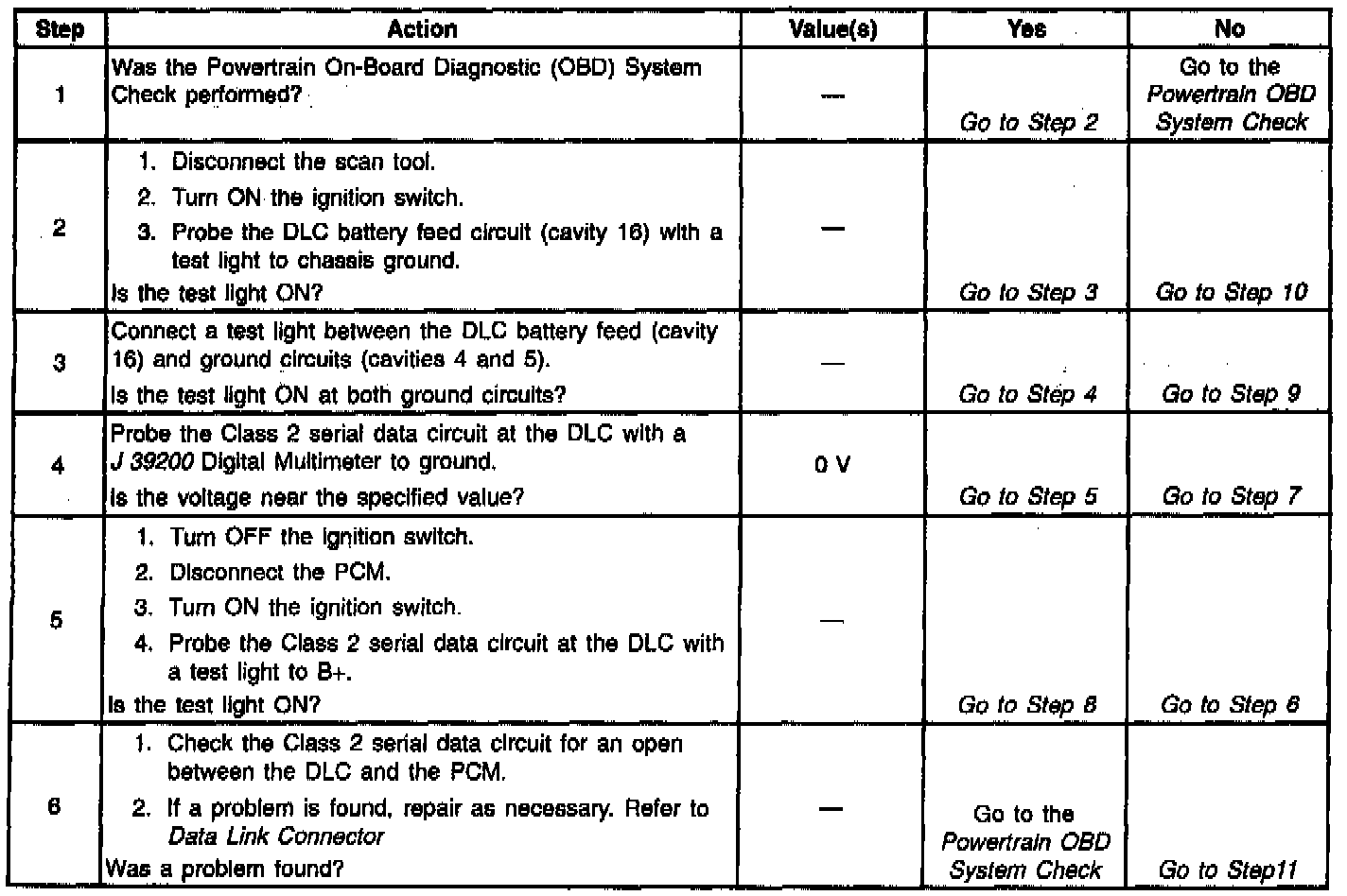 The Class 2 serial data circuit to the Data Link Connector (DLC) allows bi-directional communication between the PCM and the scan tool. If communication between the scan tool and the PCM cannot be established, the procedure in the DLC Diagnosis table should be used to diagnose the condition.