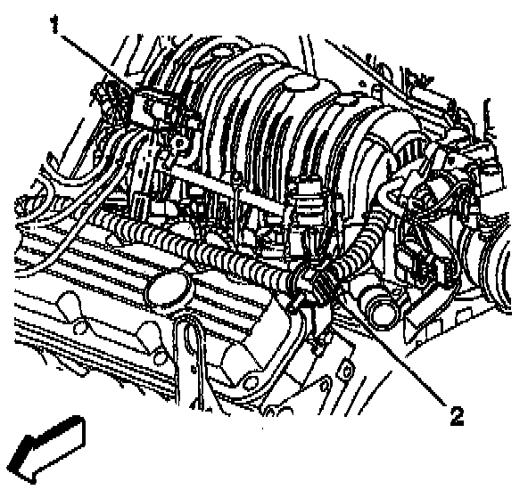 1. Disconnect the electrical connector and the vacuum hoses from the EVAP vacuum switch (2).