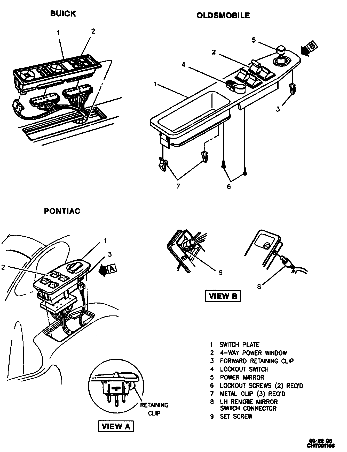 5. Switch plat by inserting a small flat-bladed tool between switch plate and trim panel at forward retaining clip (Buick and Pontiac).