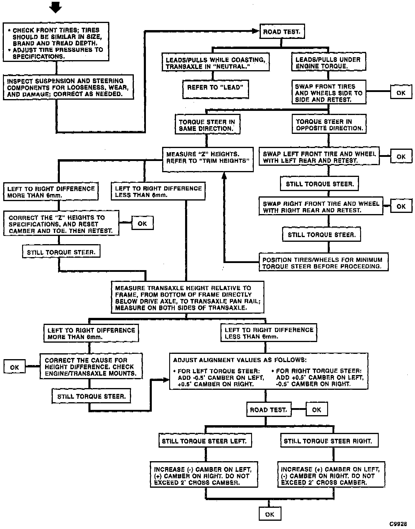 ^ Mismatched tires or unequal tire diameter. If tire pressures are correct, you can determine which front tire is causing the problem by moving the front tire and wheel assemblies to the rear one side at a time. Drive the vehicle after each switch to determine if torque steering has been corrected. It will be necessary to replace the defective tire.