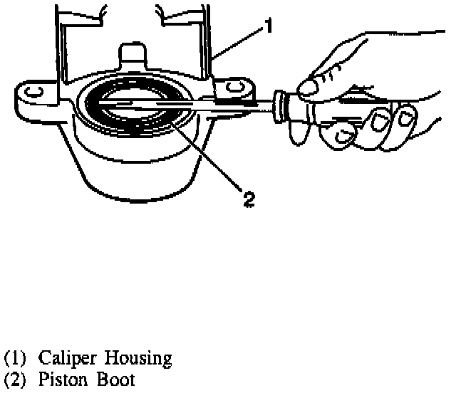 CAUTION: Do not place fingers in front of the caliper piston(s) in an attempt to catch or protect it when applying compressed air. The piston(s) may come out with force, resulting in serious injury.
