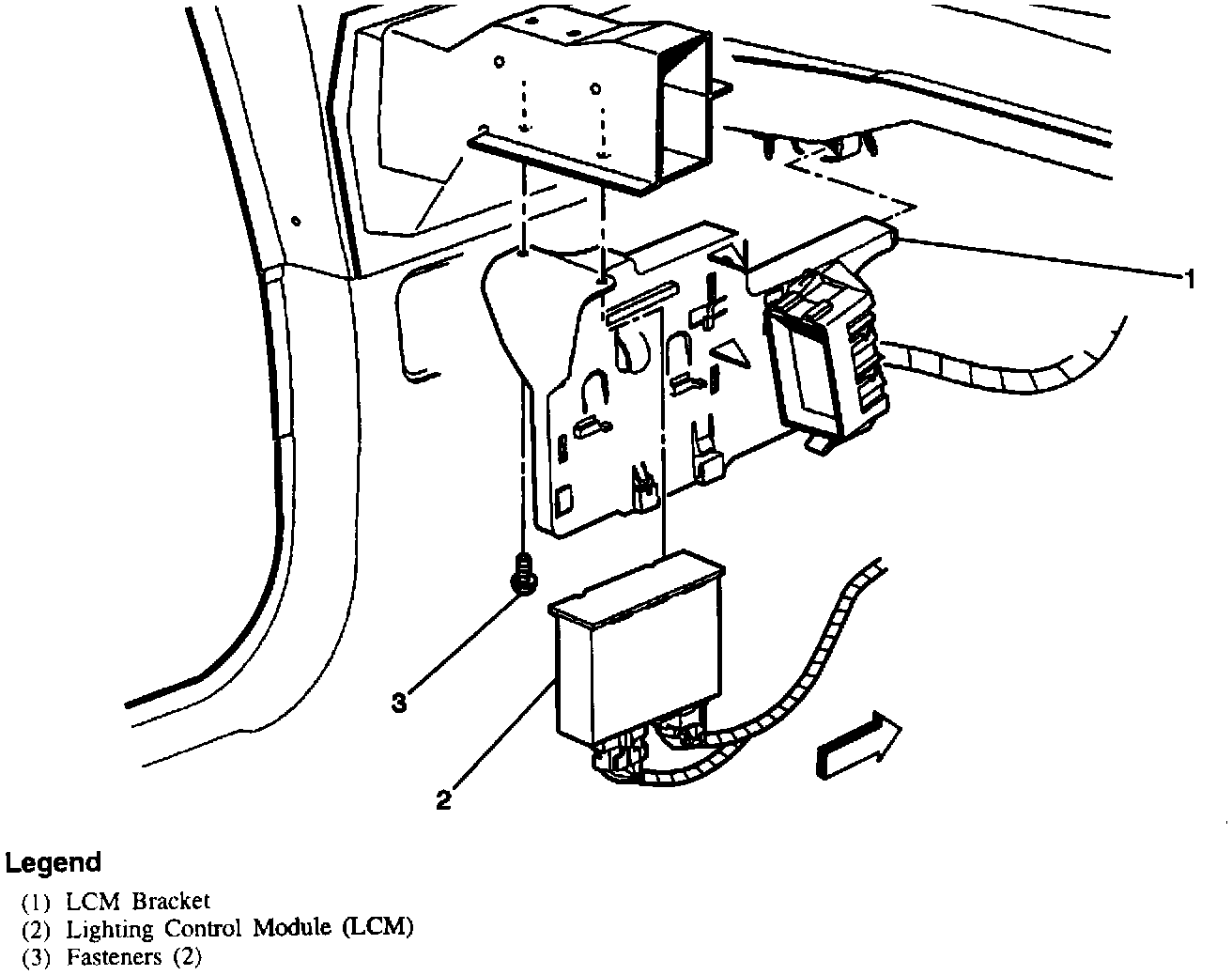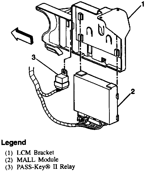^ Press down on front tab of mounting bracket and slide module toward front of vehicle until mounting rails disengage.