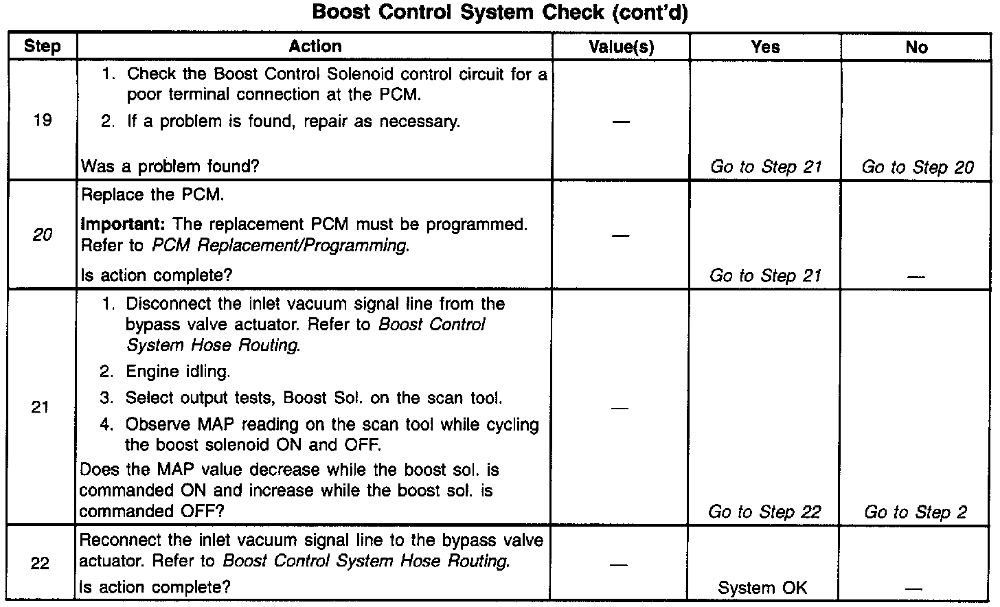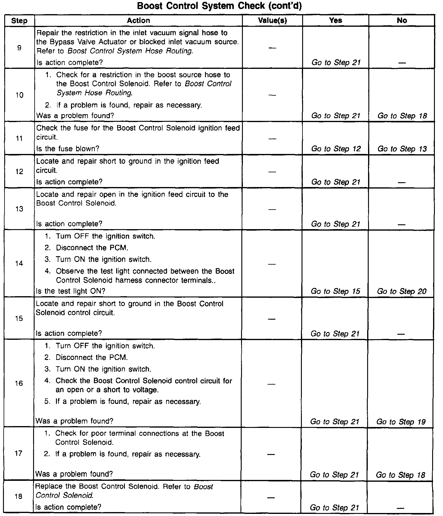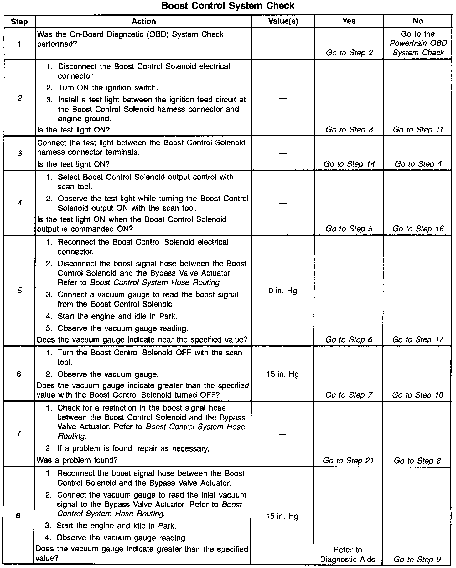 If the Boost Control System Check has been performed and no electrical or vacuum related fault is noted, check for the following conditions: