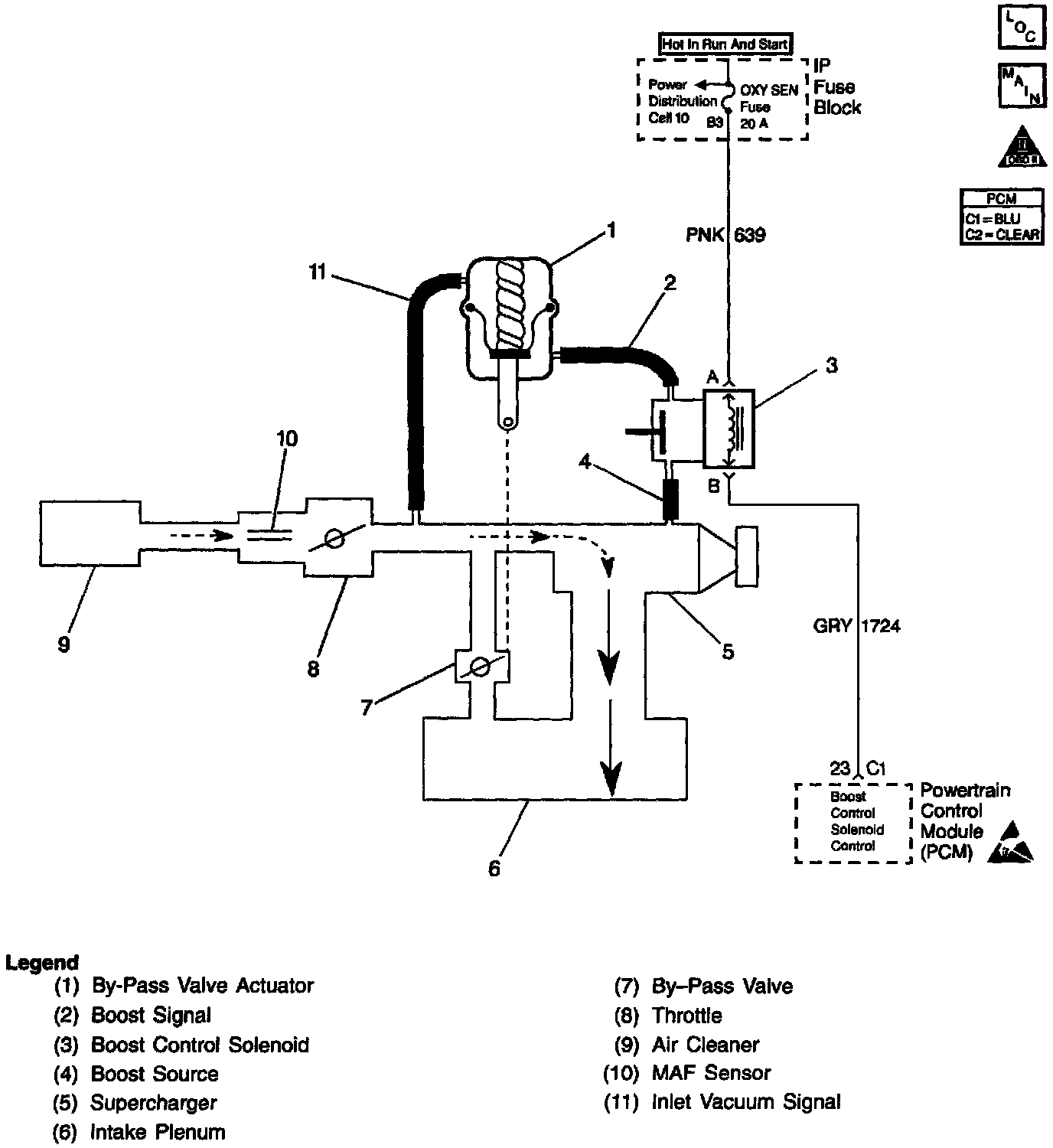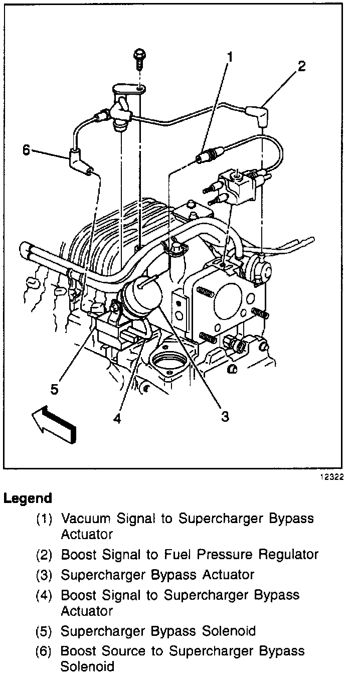 Under most conditions, the PCM commands the boost control solenoid to operate at a 100% duty cycle (ON) to allow full boost pressure upon demand. However, if reverse gear is selected or the PCM detects rapid deceleration or engine load is extremely high, reduced boost pressure is desired. Under these conditions, the PCM commands the boost control solenoid to operate at a 0% duty cycle (OFF), which opens the bypass valve. With the Bypass valve open, boost pressure is reduced by recirculating intake air back through the supercharger inlet.