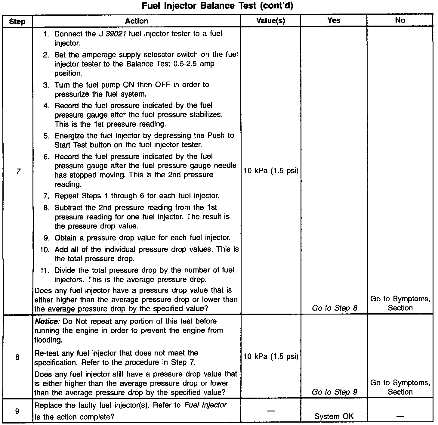 7. If the pressure drop value for each fuel injector is within 10 kPa (1.5 psi) of the average pressure drop value, the fuel injectors are flowing properly. Calculate the pressure drop value for each fuel injector by subtracting the second pressure reading from the first pressure reading. Refer to the illustration above.