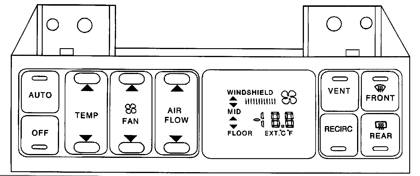 Each operating mode button (except OFF) contains an LED indicator that illuminates when the operator selects that mode. The rear window defogger also has an LED indicator.The heater and A/C control assembly includes a vacuum-fluorescent display.