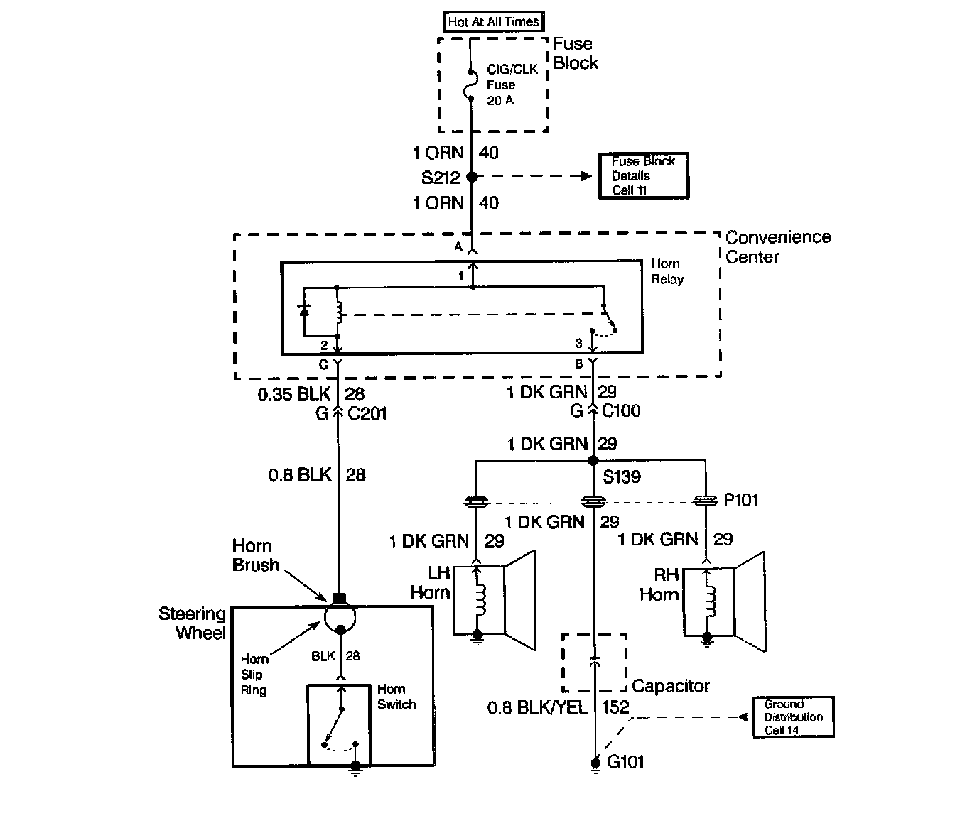 When diagnosing a horn problem use the service information located in the Horns (cell 40) service category. The following schematic is a typical example of a schematic with its supporting text.