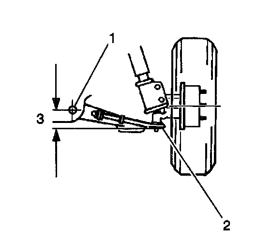 8. Measure the clearance (3) between the centerline of the rear bolt bushing (1) and the lowest point on the ball joint housing (2)(except the grease fitting). The clearance (3) should measure 50 - 70 mm (1 15/16 - 2 3/4 inch) on the LSS, Eighty-Eight, LeSabre, and Bonneville.