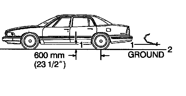 11. Measure the clearance (1) between the rear underbody and the ground (2). The clearance (1) should measure 236-256 mm (9 9/32 - 10 1/16 inch) on the LSS, Eighty-Eight, LeSabre, and Bonneville.