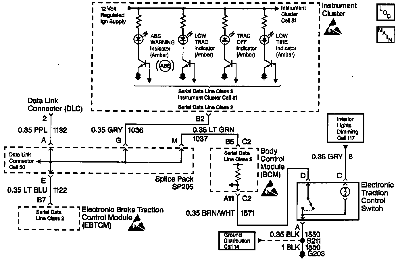 The Body Control Module (BCM) receives the input from the Traction Control Switch. The BCM then sends a class 2 message to the EBTCM telling the EBTCM the state of the switch. The BCM supplies voltage to the TCS switch and when the TCS switch is depressed the BCM sees the voltage go low and sends the EBTCM the message that the TCS switch state has changed. When the EBTCM receives the message from the BCM that the switch state has changed it turns on or off Traction Control and its TRAC OFF indicator depending on its previous state.