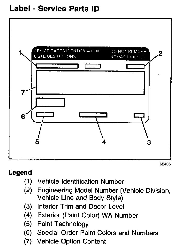 The Service Parts Identification Label aids the service personnel in identifying the parts and options originally installed on the vehicle. The label is located in the trunk on the underside of the spare tire cover.