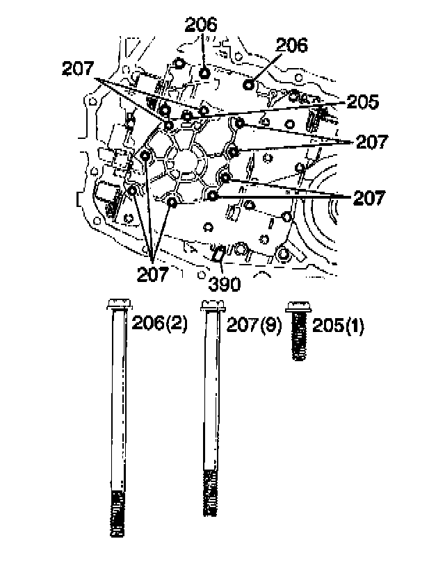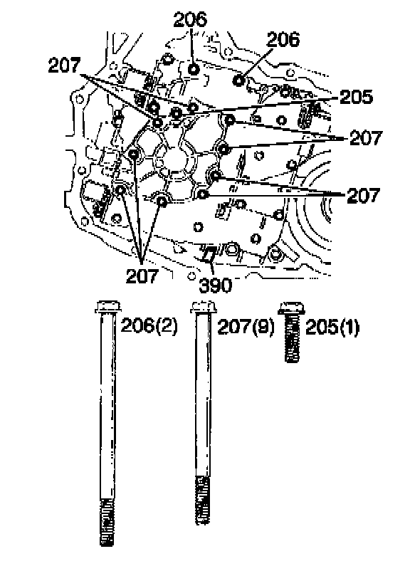 2. Remove the oil pump bolts (205-207).
