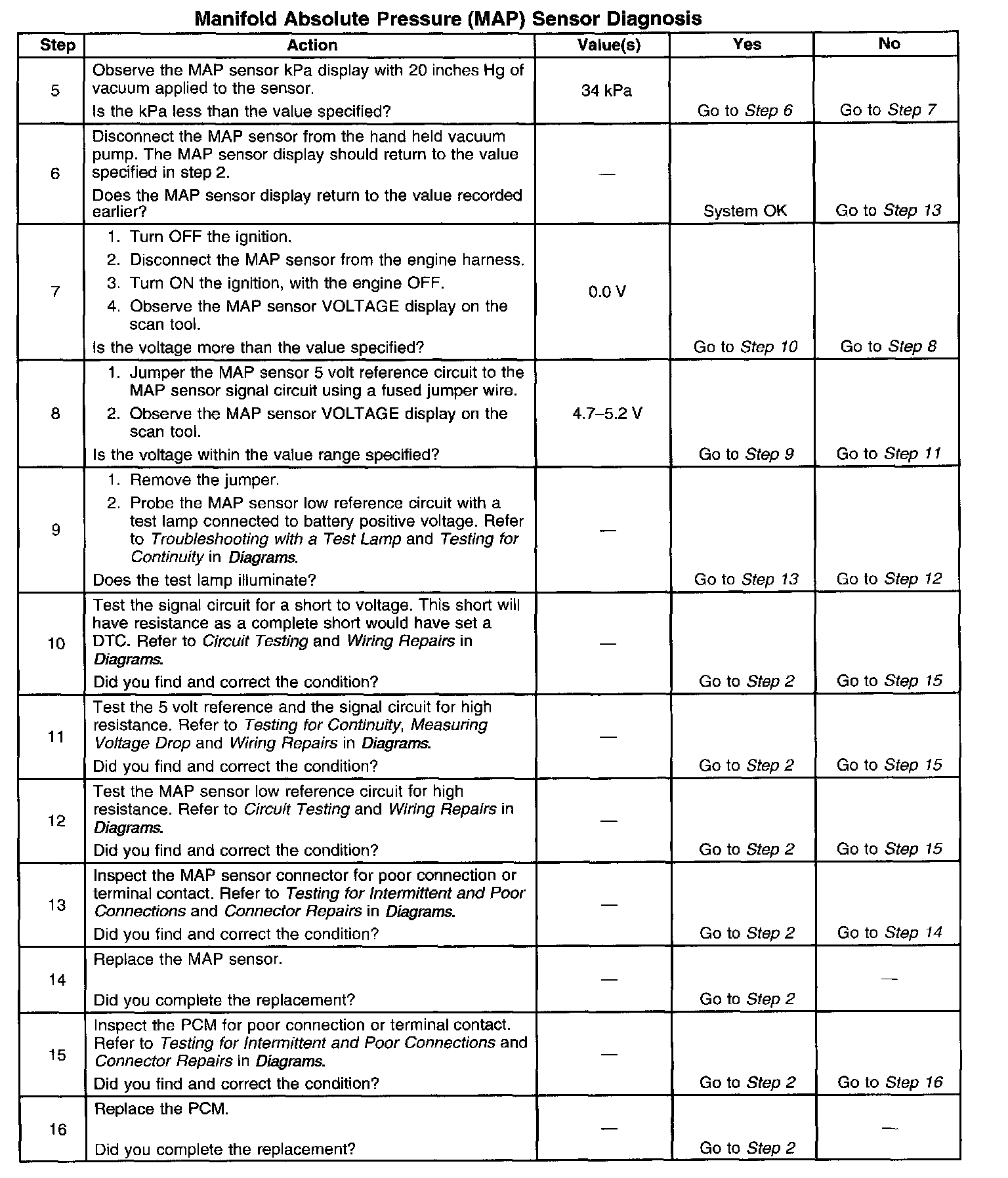 BARO reading may also be updated whenever the engine is operated at wide-open throttle. The PCM monitors the MAP sensor signal for voltage outside of the normal range. If the PCM detects a MAP sensor signal voltage that is excessively high, DTC P0108 will set. IP the PCM detects a MAP sensor signal voltage that is excessively low, DTC P0107 will set.