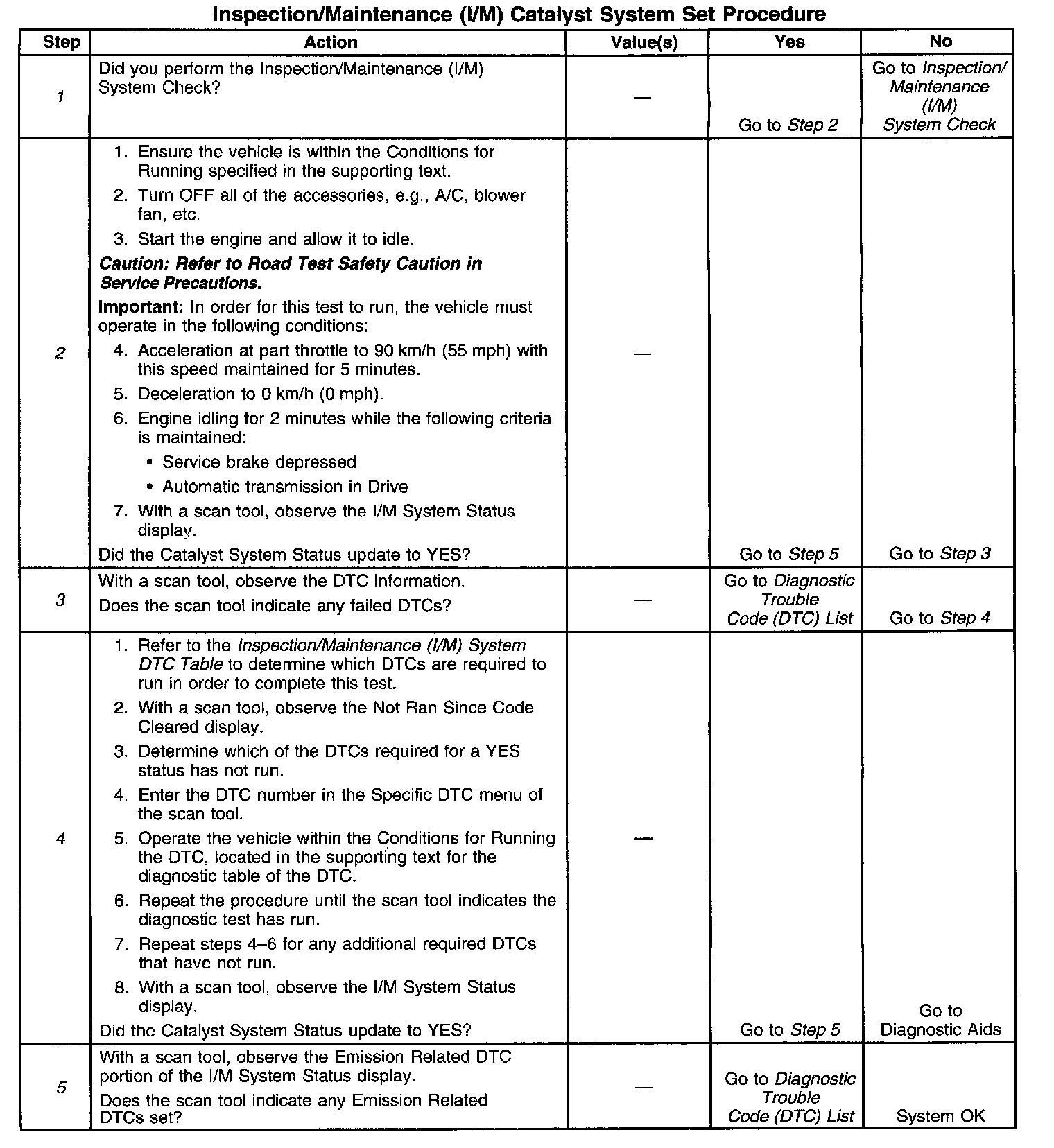 ^ The control module runs a maximum of 6 tests per trip until the Catalyst System Status updates to YES. If the status does not update, the test outlined in this procedure can be repeated until the I/M System Status updates to YES.