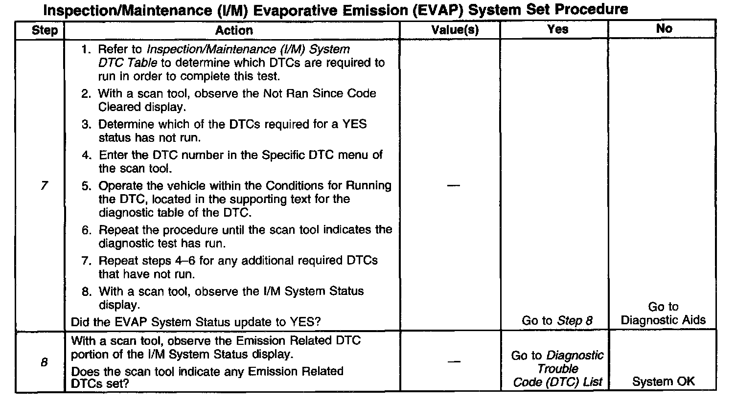 6. This step is to identify a first failure of a type B DTC. A DTC only appears on the I/M System Status display when it becomes a MIL illuminating DTC. This occurs on the second failure of a type B DTC. A first failure of a type B DTC will not allow the I/M System Status to update to YES. Refer to Diagnostic Aids.