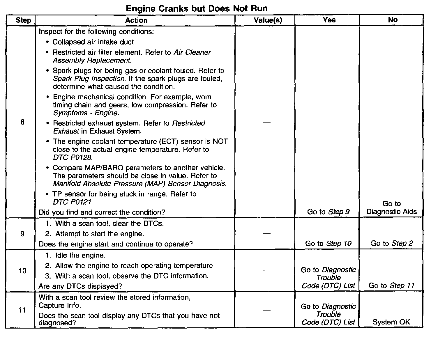 The Engine Cranks but Does Not Run diagnostic table is an organized approach to identifying a condition that causes an engine not to start. The Engine Cranks but Does Not Run diagnostic table directs the service technician to the appropriate system diagnosis. The Engine Cranks but Does Not Run diagnostic table assumes the following: