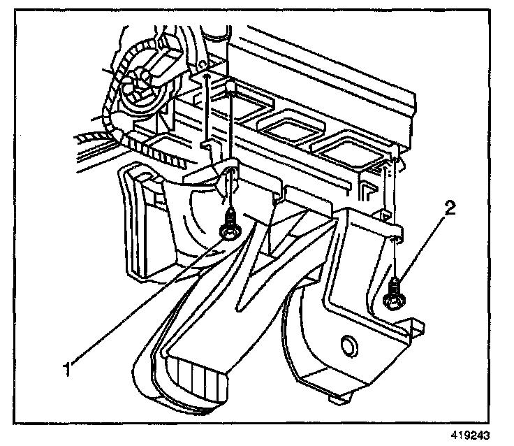 7. Remove the air distributor duct screws (1,2). Due to the difficulty in the removal of the right side screw (2), it will not be necessary to install upon reassembly.