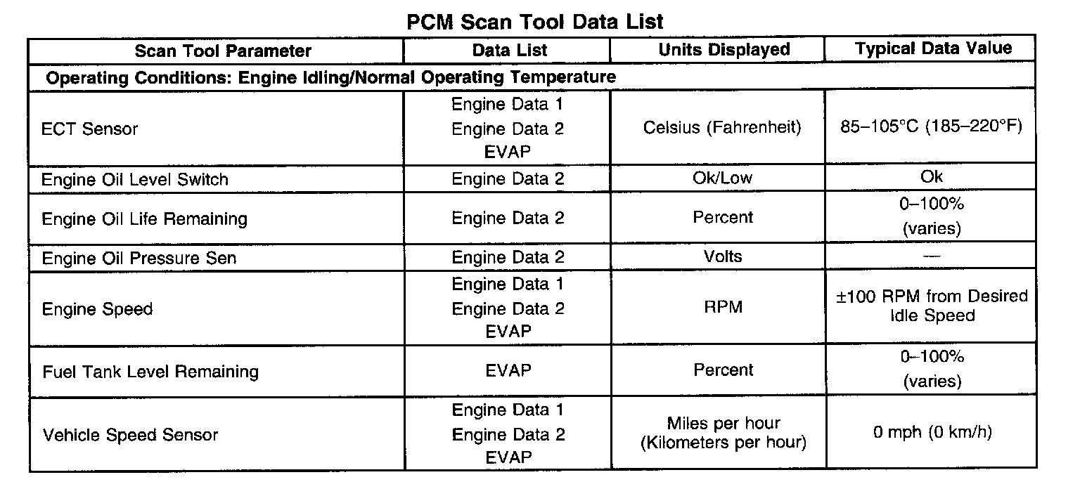 Scan Tool Data List - Powertrain Control Module (PCM)