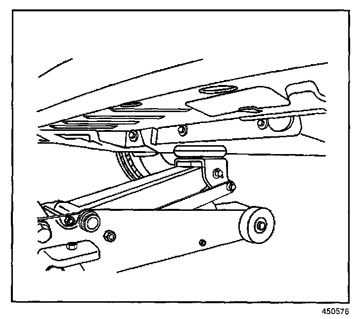 When lifting a vehicle with a vehicle jack or a floor jack, block the wheels at the opposite end from which you are lifting. Use jack stands to provide additional support.Under the Front Suspension Crossmember