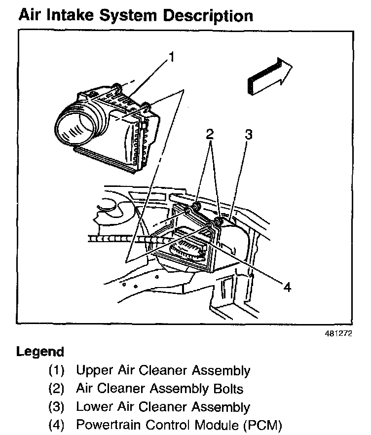 The air induction system provides contaminant and sound filtration of the outside air as it is drawn into the engine. A remotely mounted air cleaner prevents contaminants in the air from entering the engine. The filtered air is routed into a lower and upper air cleaner assembly. The air then enters the engine by flowing through the throttle body, into the intake manifold, through the cylinder head intake ports, and into the cylinders.