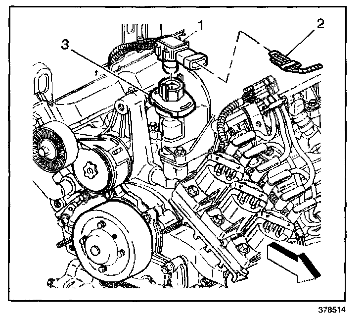 2. Position and install the MAP sensor (1) to the PCV valve cover (3). Ensure that the locking tabs engage to hold the MAP sensor to the PCV valve cover.