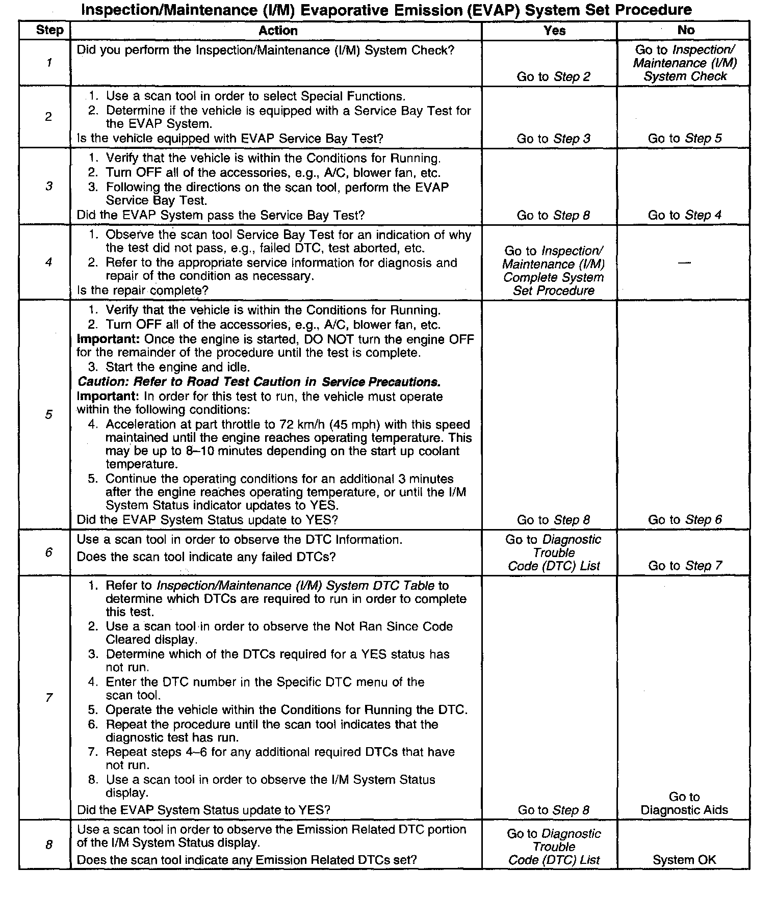 6. This step is to identify a first failure of a type B DTC. A DTC only appears on the I/M System Status display when it becomes a MIL illuminating DTC. This occurs on the second failure of a type B DTC. A first failure of a type B DTC will not allow the I/M System Status to update to YES. Refer to Diagnostic Aids.