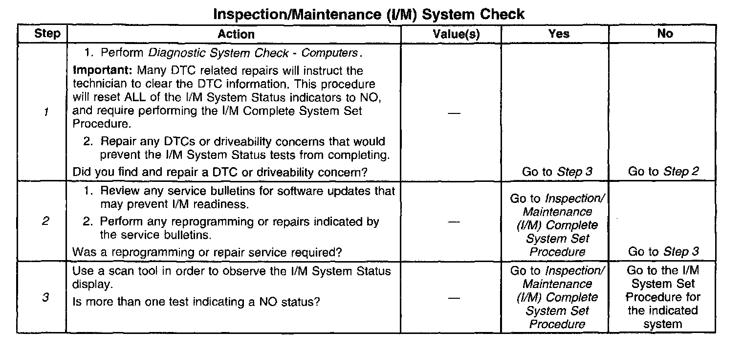 1. Any DTCs set, even those that are not listed in the Inspection/Maintenance System DTC Table, may prevent the required DTCs from running. If there is any question as to whether a set DTC is disabling the required I/M diagnostic, review the Conditions for Running in the diagnostic procedures for the DTC required by the I/M diagnostic. A list of disabling DTCs, if applicable, is contained in the supporting text for that DTC.