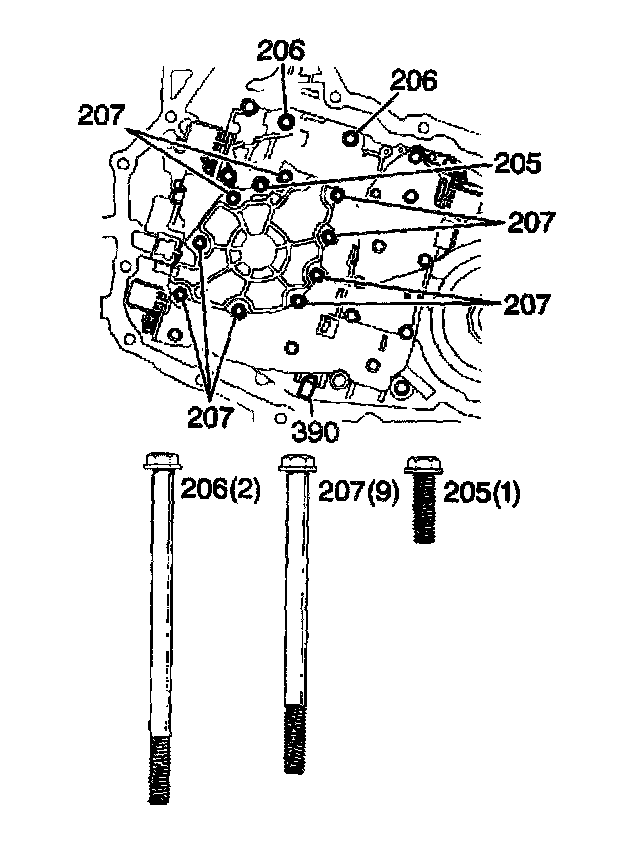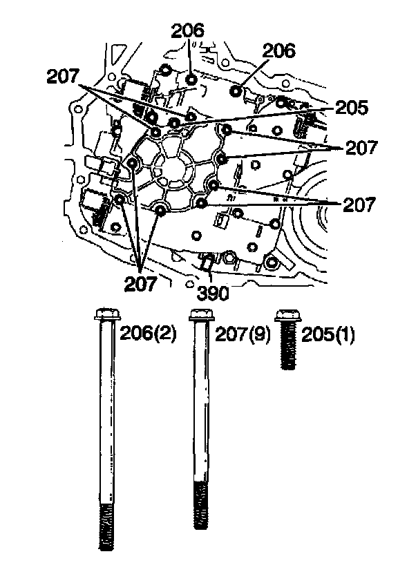 2. Remove the oil pump bolts (205-207).