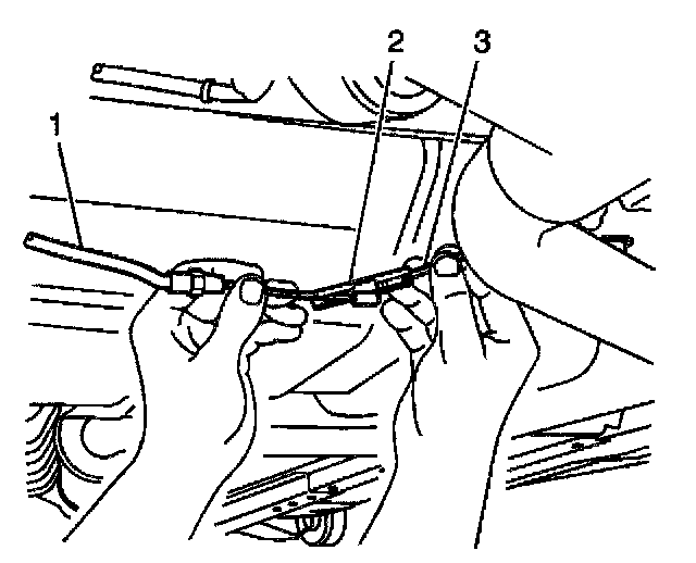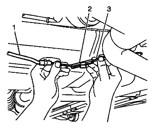 6. Disconnect the front cable (1) from the rear cable (3) at the connector clip (2).