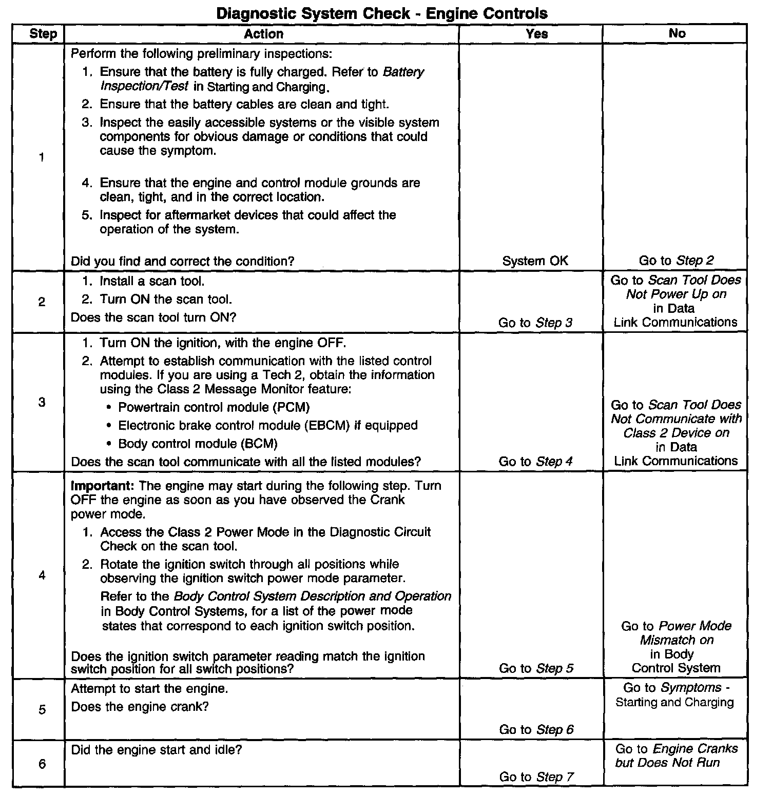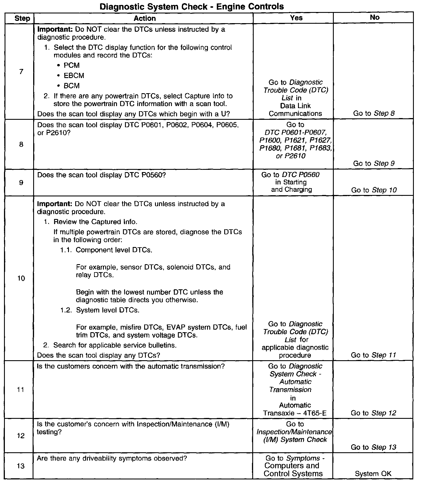 The Diagnostic System Check is an organized approach to identifying a condition created by an electronic engine control system malfunction. The Diagnostic System Check must be the starting point for any driveability concern. The Diagnostic System Check directs the service technician to the next logical step in diagnosing the concern. Understanding the table and using the table correctly reduces diagnostic time and prevents the replacement of good pans.
