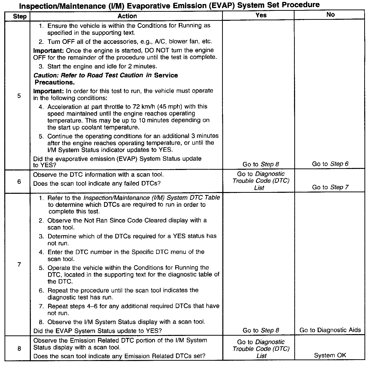 The purpose of this test is to satisfy the enable criteria necessary to execute inspection/maintenance (I/M) readiness diagnostics for the evaporative emission (EVAP) system. The test may be used to set the I/M System Status indicators to YES. The I/M System Status display on the scan tool indicates whether or not the control module has completed the required test. The required test is complete when either all of the DTCs comprising the test have run and passed, or when any one of the DTCs comprising the test has illuminated the malfunction indicator lamp (MIL). Once the test is complete, the I/M System Status display will indicate YES in the completed column. Performing a visual inspection prior to running the EVAP test may prevent having to repeat the test due to the fact that a failed or aborted test will require the vehicle to cool down in order to meet the enable criteria to run another test.