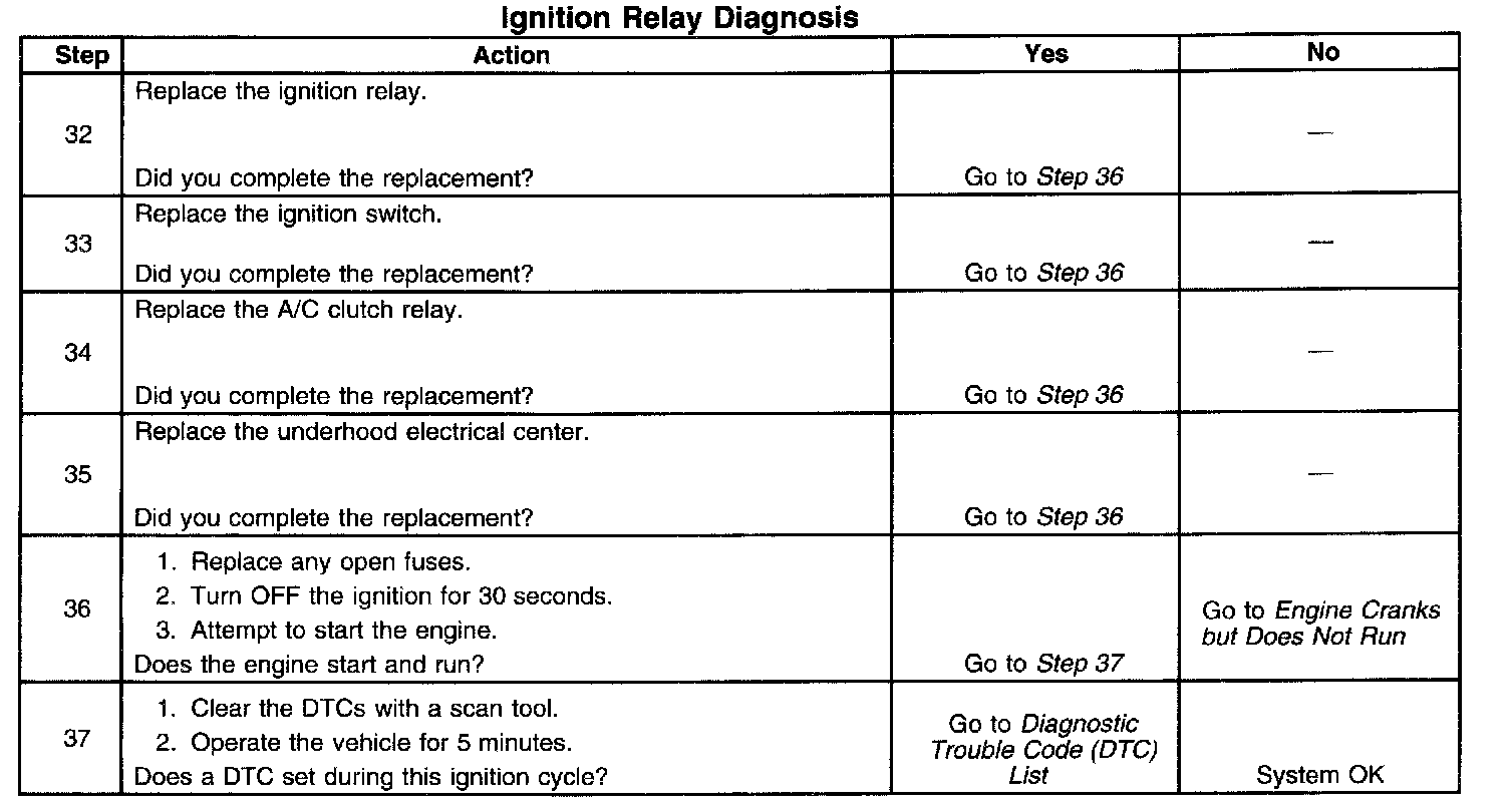 If the ignition relay fails to close, the engine will crank, but will not run. The class 2 communications will be available with the use of a scan tool.