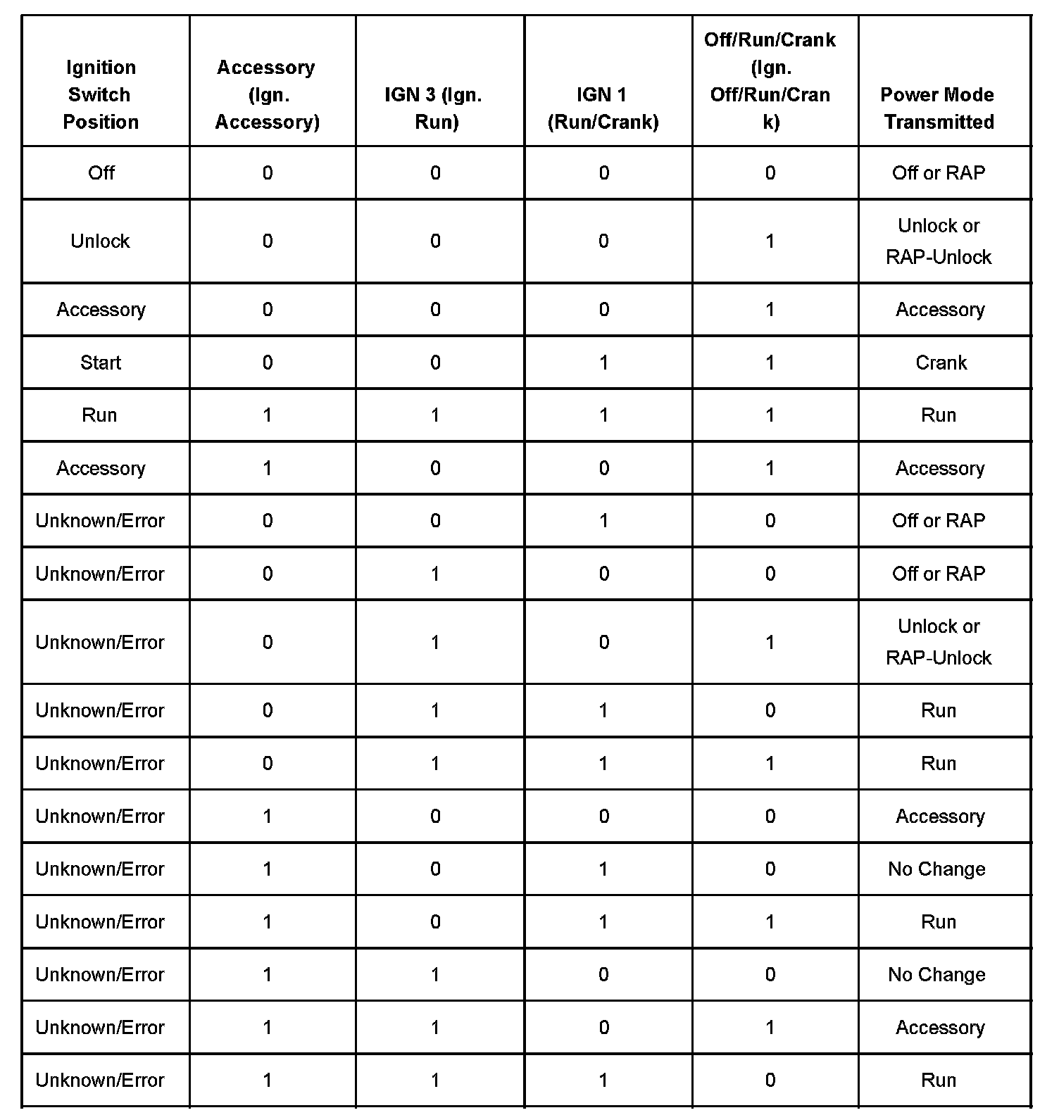 4-Wire Ignition Switch Table
