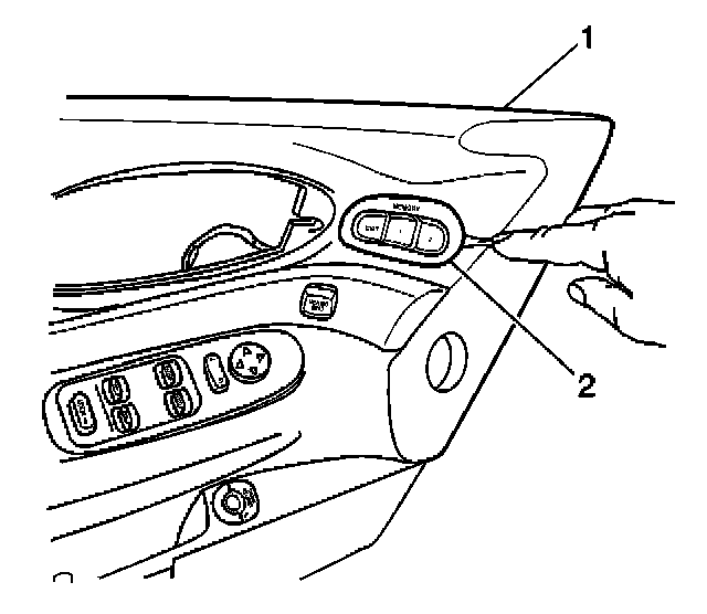 1. Use a small flat bladed tool in order to gently pry the memory seat switch (2) out of the door trim panel (1).