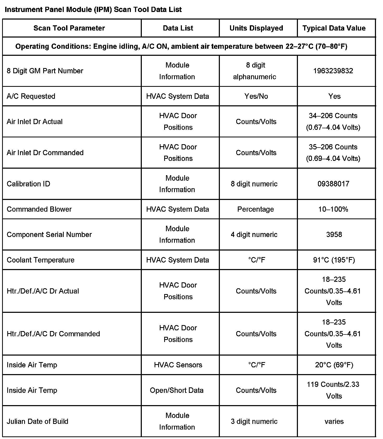 Instrument Panel Module (IPM) Scan Tool Data List - Part 1: