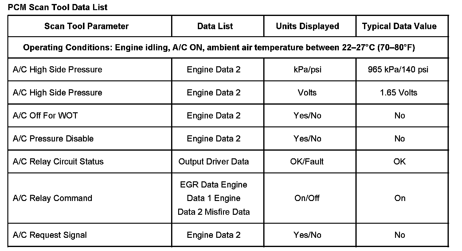 The scan tool data values were taken from a known good vehicle under the following conditions: