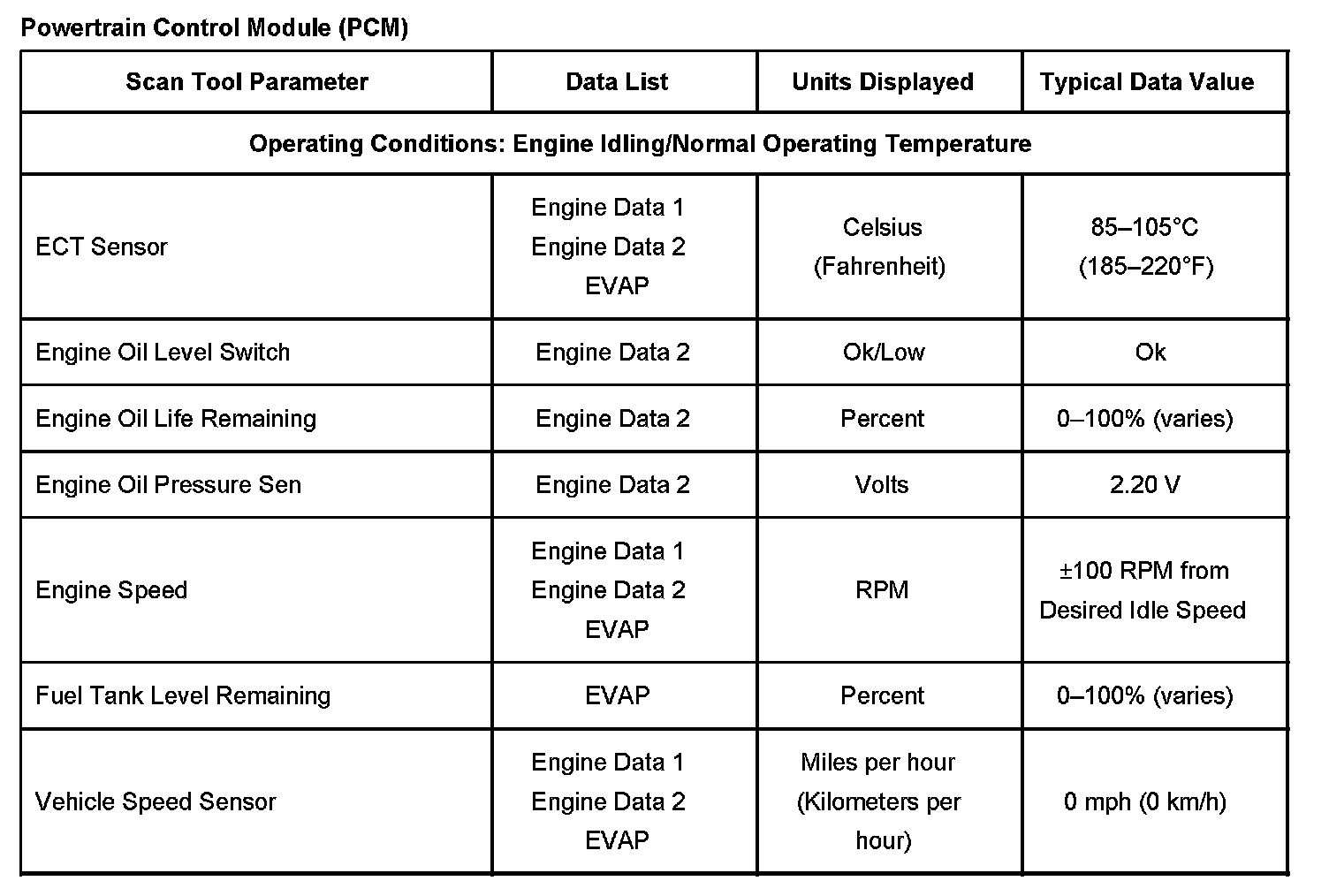 Scan Tool Data List - Powertrain Control Module (PCM)