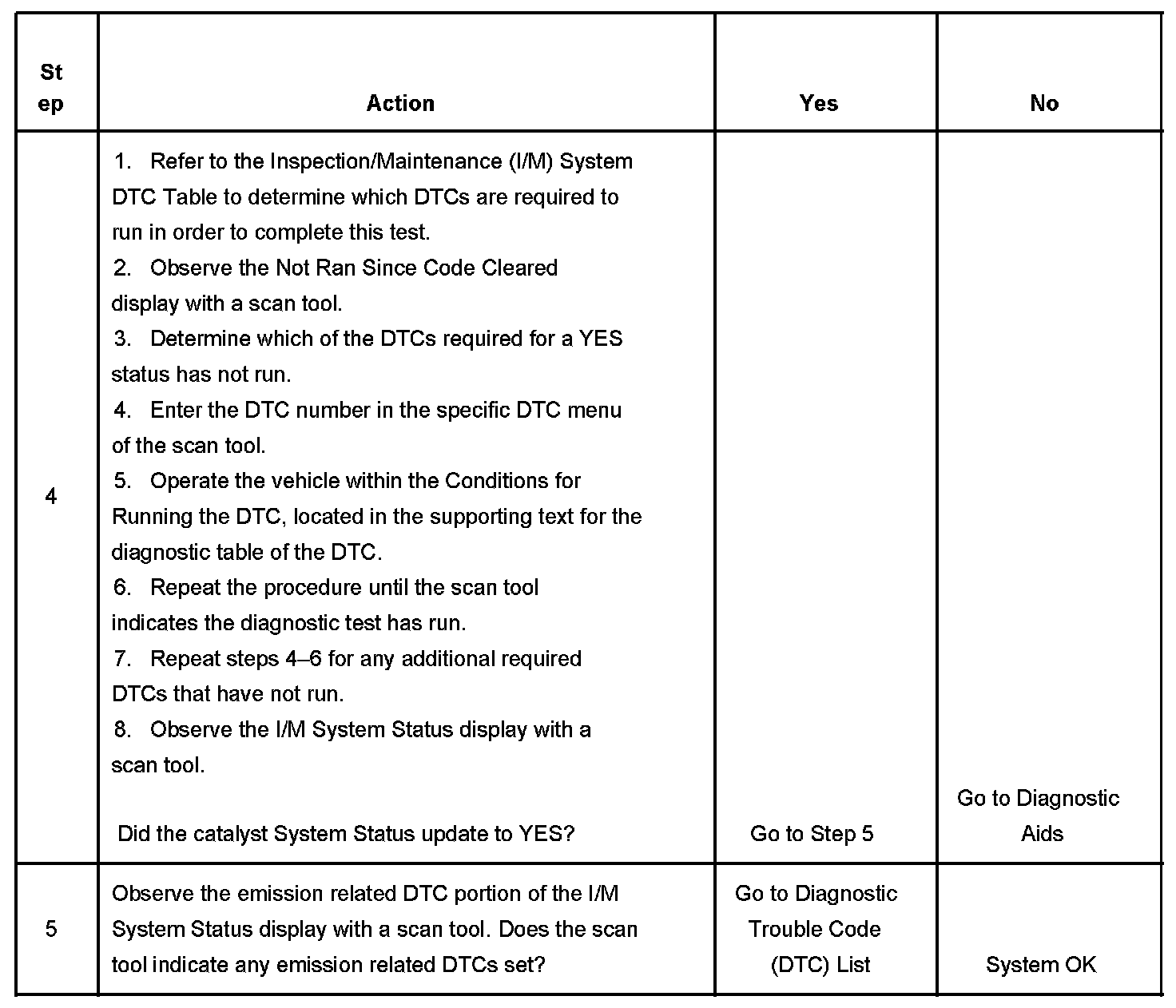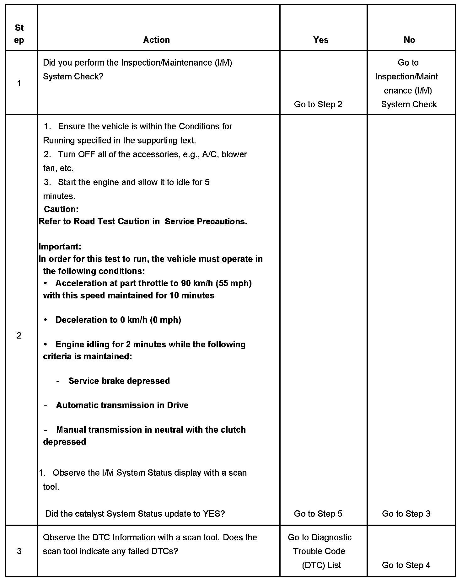 The purpose of this test is to satisfy the enable criteria necessary to execute inspection/maintenance (I/M) readiness diagnostics for the catalyst system. The test may be used to set the I/M System Status indicators to YES. The I/M System Status display on the scan tool provides an indication of whether the control module has completed the required tests. The I/M System Status does not indicate that the tests have passed or failed. When all of the diagnostics for a specific system have run and passed, the I/M System Status will update to YES. If a test for a specific system has failed, the I/M System Status will update to YES, indicating a determination was made even if all of the other tests for that system have not run.