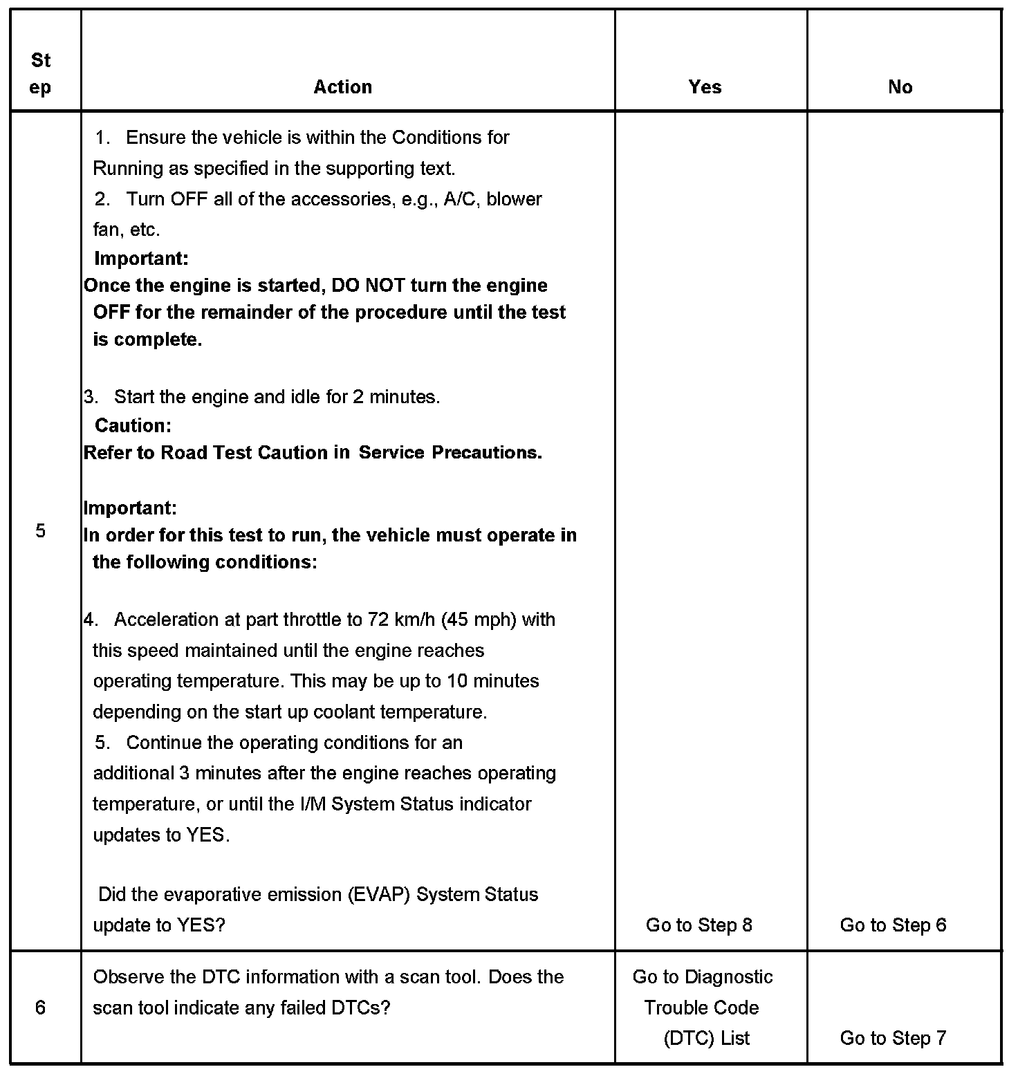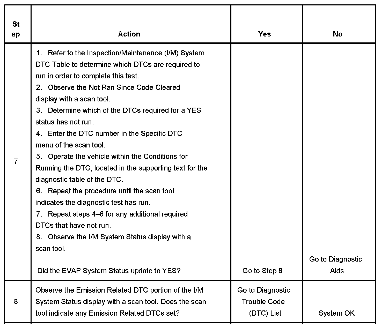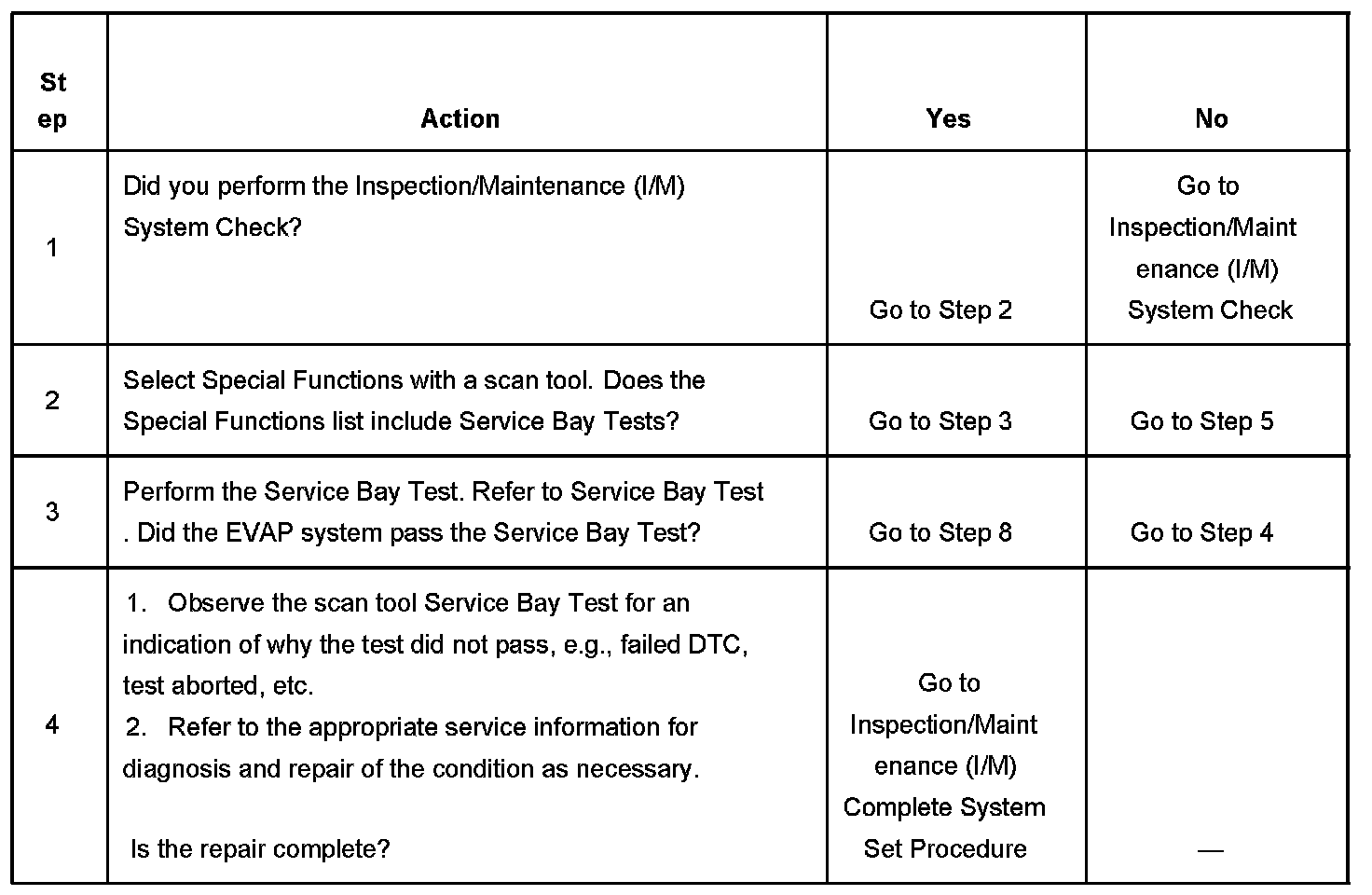 The purpose of this test is to satisfy the enable criteria necessary to execute inspection/maintenance (I/M) readiness diagnostics for the evaporative emission (EVAP) system. The test may be used to set the I/M System Status indicators to YES. The I/M System Status display on the scan tool indicates whether or not the control module has completed the required test. The required test is complete when either all of the DTCs comprising the test have run and passed, or when any one of the DTCs comprising the test has illuminated the malfunction indicator lamp (MIL). Once the test is complete, the I/M System Status display will indicate YES in the completed column. Performing a visual inspection prior to running the EVAP test may prevent having to repeat the test due to the fact that a failed or aborted test will require the vehicle to cool down in order to meet the enable criteria to run another test.