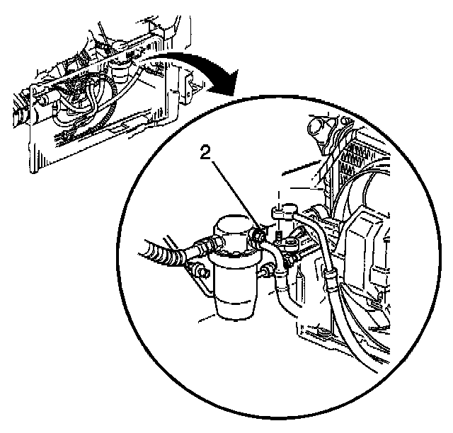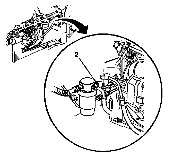 7. Install the A/C compressor hose nut (2) to the accumulator.