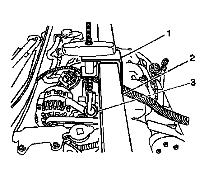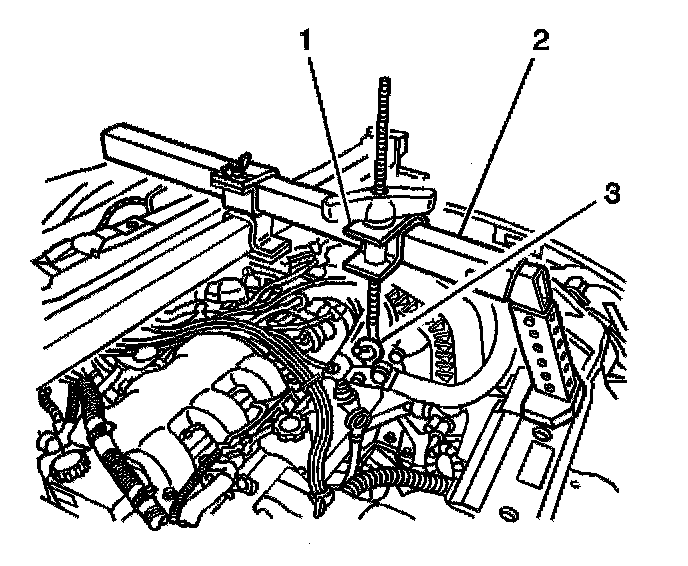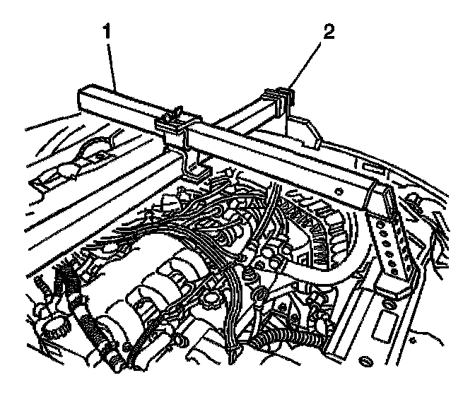 5. Install the J 36462-A (1) to the cross bar (2).
