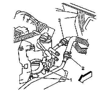 8. Remove the throttle body inlet and outlet hoses (1) from the thermostat bypass pipe.