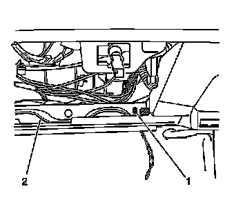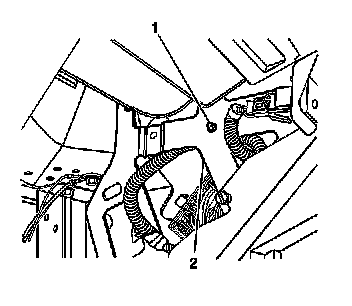 4. Install the wiring harness retainer (1) to the passenger knee bolster bracket (2).